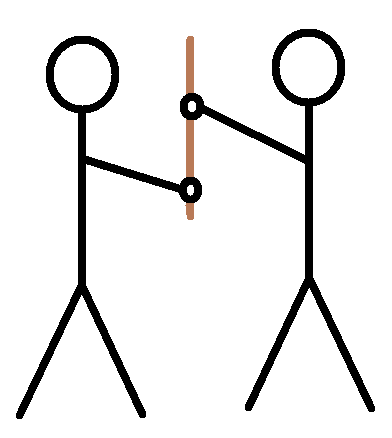 Though for practical applications, you really want to grab about half-way up his stick so that when you punch it forward, the tip of his stick moves with even greater velocity (this is leverage and angular velocity at work). This balances the applied torque from your pushing hand and the leverage that multiplied the distance traveled by the tip of the stick versus your hand.