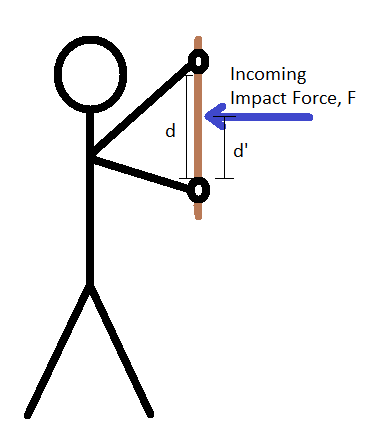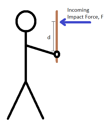 The incoming force results in two reaction forces, one from each hand. Since torque can be calculated around any point, we can look at the torque at each hand individually. For the torque at the top hand, the reaction force at the bottom hand fights the torque of the incoming force. For the torque at the bottom hand, the reaction force of the top hand fights the torque of the incoming force. Two hands are better than one, clearly, but two-handed blocks are actually more than twice as easy as single-handed blocks. Why? Because instead of having to provide all the torque with the hand (the pinky side and the thumb side push the stick in opposite directions, basically), the torque is provided by two linear forces from the arms.