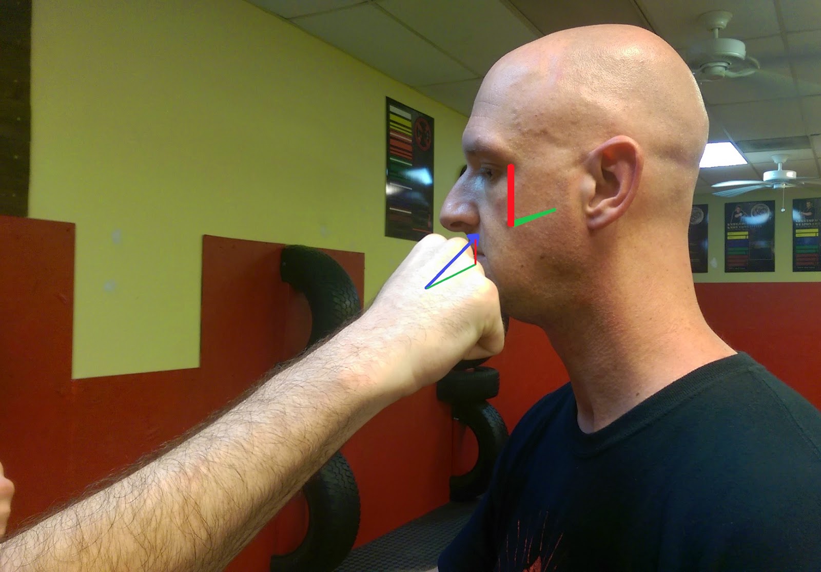 Here, the axis that is parallel to surface of the contact point is the “wasted” axis (red axis), and the axis that is perpendicular to the surface of the contact point is the “useful” axis (green axis). Now, break the vector of the incoming fist’s motion (blue vector) into components along these axes (red and green components…take note of my superbly mediocre mspaint skills). Hopefully, the axis names make the point for me here. Any motion that is parallel to the surface is wasted. This kind of motion is what produces strikes that glance off of the target. Only the perpendicular motion affects the target. So, this is our first structural insight: hit perpendicular to the surface for maximum effect.