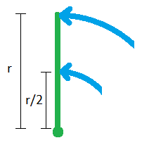 The picture could represent a swinging stick. Though I’m just using it to illustrate the basics here. Since the stick is rotating about one end, each part of the stick has the exact same angular velocity, ω. The same number of radians are being swept out per second. However, the linear velocity of each point is different based on how far from the center of rotation it is. Here, the end point has a velocity of rω, but the midpoint has a velocity of (r/2)ω. That’s half the velocity.